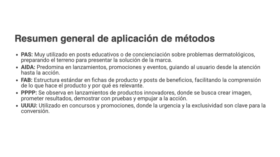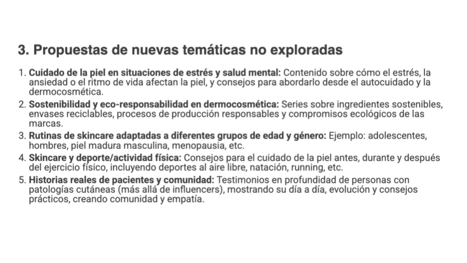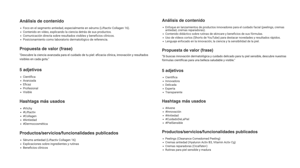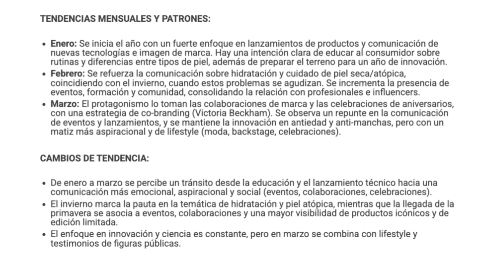 Esto te permite ver cosas que quizá esté haciendo una marca líder con la que no puedes competir en recursos o producto, pero sí en atención en redes. También te ayuda a encontrar caminos nuevos, formatos que están creciendo, estructuras narrativas o visuales que ya están funcionando en el sector y que tus competidores directos todavía no han incorporado, pero los líderes o las marcas más alternativas sí. Esto te permite detectar nichos que tu competencia directa no está trabajando aún y, si tienen sentido para tu marca, te permite ocupar ese hueco antes que el resto.
