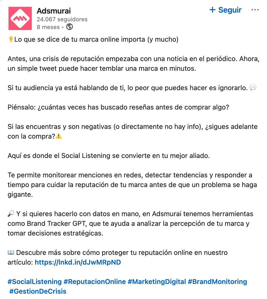 While commercial content is far less common, it still represents nearly a third of the posts from We Are Marketing. These posts often include clear CTAs like "contact us to improve your strategy" or "let's talk about optimizing your marketing plan".